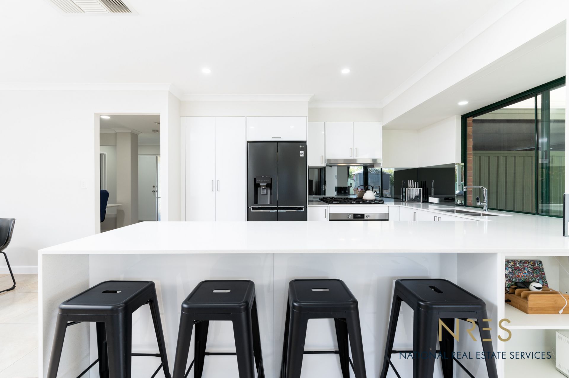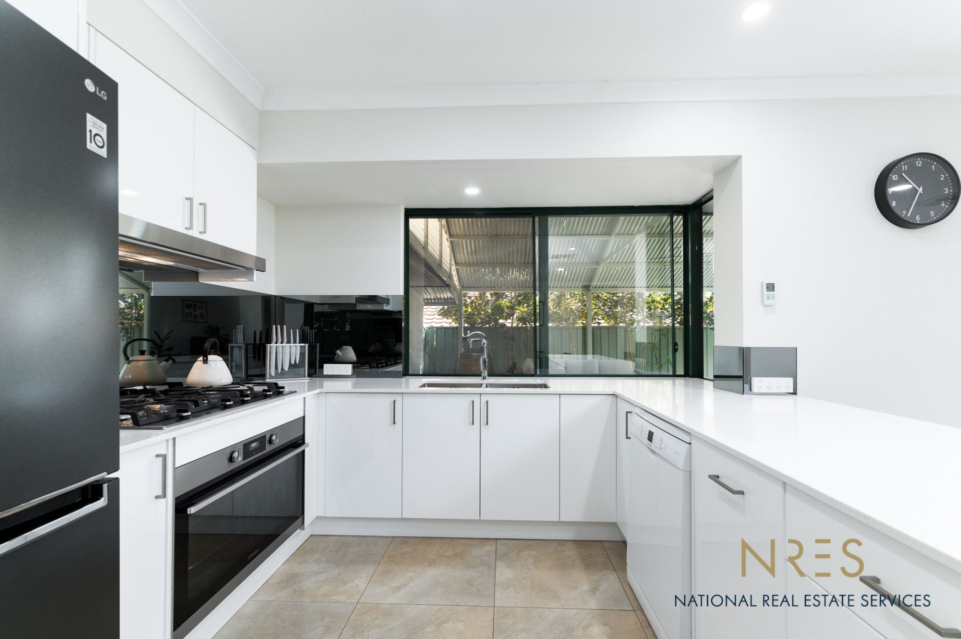 • Well-appointed kitchen with modern appliances, ample cabinet space, mirrored splashbacks and plenty of bench space